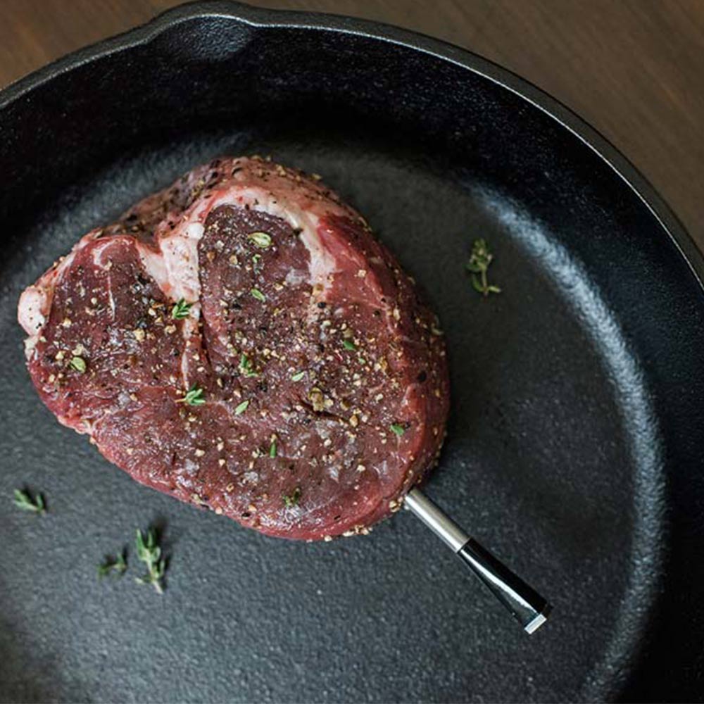 Das Meater Fleischthermometer mit App-Steuerung. Das perfekte Steak, der perfekte Braten… wird Dir mit MEATER, dem ersten Smartphone gesteuerten Grillthermometer, ausgezeichnet gelingen. Wie viel Grad das Fleisch innen und außen hat wird live auf Dein Smartphone gesendet. Sobald der Braten fertig ist, erinnert eine Pushnachricht auf dem Display daran, ihn aus dem Ofen zu holen.