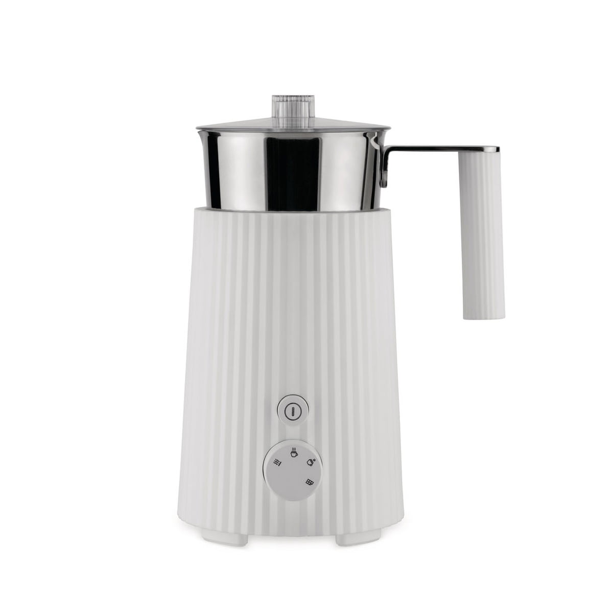 Der Milchaufschäumer besitzt eine Start/Stop-Taste, sowie einen Drehknopf und ist in unterschiedlichen Ausführungen erhältlich. Plissé gibt es in den Farben Grau, Weiß, Schwarz und Rot. Design: Michele De Lucchi.